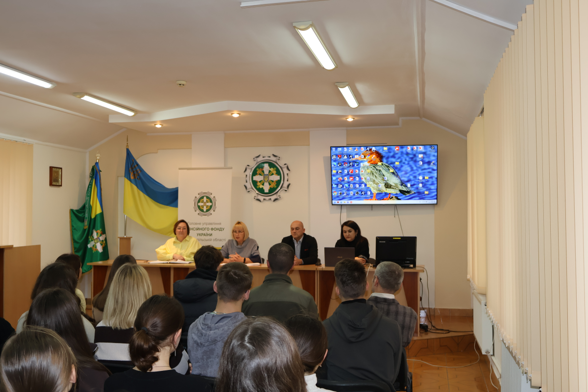 Під час зустрічі Алла Якубовська, перший заступник начальника Головного управління, ознайомила студентську молодь із головними напрямами роботи Головного управління; формуванням бюджету Пенсійного фонду України, основними аспектами функціонуванням солідарної та накопичувальної систем пенсійного страхування, розширенням функцій Фонду щодо призначення і виплати субсидій та пільг на оплату житлово-комунальних послуг, страхових виплат, державних соціальних допомог. Окрім цього, проінформувала про послуги, які надаються спеціалістами в сервісних центрах під час прийому громадян. Зокрема, Алла Якубовська зазначила, що в органах Пенсійного фонду України постійно відбувається трансформація державних послуг задля задоволення потреб та очікувань громадян. Також фахівець звернула увагу на важливість набуття страхового стажу для отримання права на пенсійне та соціальне забезпечення, можливості добровільної участі у загальнообов’язковому державному пенсійному страхуванні й необхідності офіційного оформлення трудових відносин при працевлаштуванні.