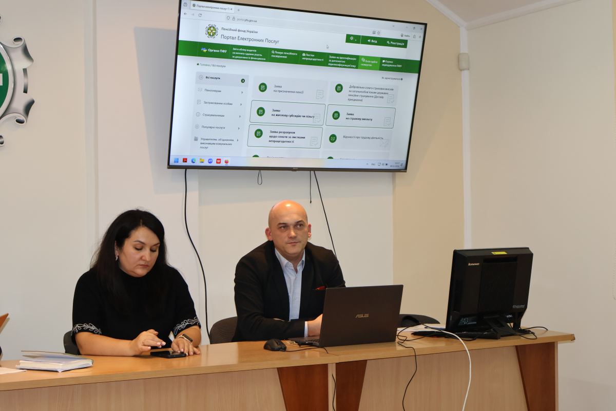 Василь Динис, начальник відділу методології та контролю за використанням даних інформаційних систем та електронних реєстрів, у свою чергу, розповів про онлайн-сервіси Пенсійного фонду та наочно продемонстрував учасникам зустрічі як саме застраховані особи можуть отримувати послуги дистанційно. Звернув увагу, що цифрові технології дають широкі можливості у сфері обслуговування громадян. Окрім цього, кожен громадянин має змогу через вебпортал отримати ряд онлайн-послуг: подати заяву, отримати довідки з QR-кодом, контролювати сплату страхових внесків, здійснених роботодавцем і самостійно сплачених застрахованою особою, та зарахування страхового стажу, тощо.