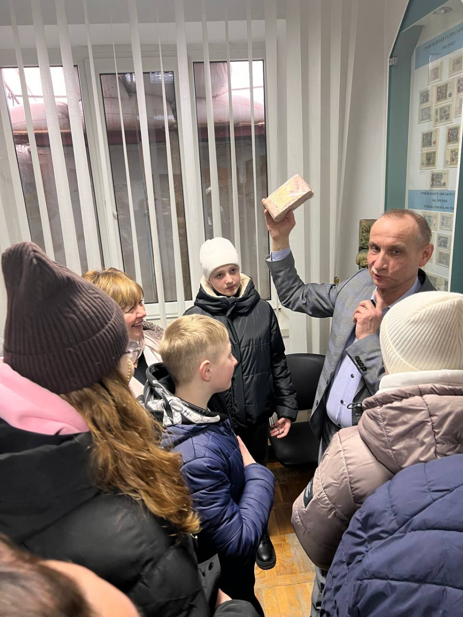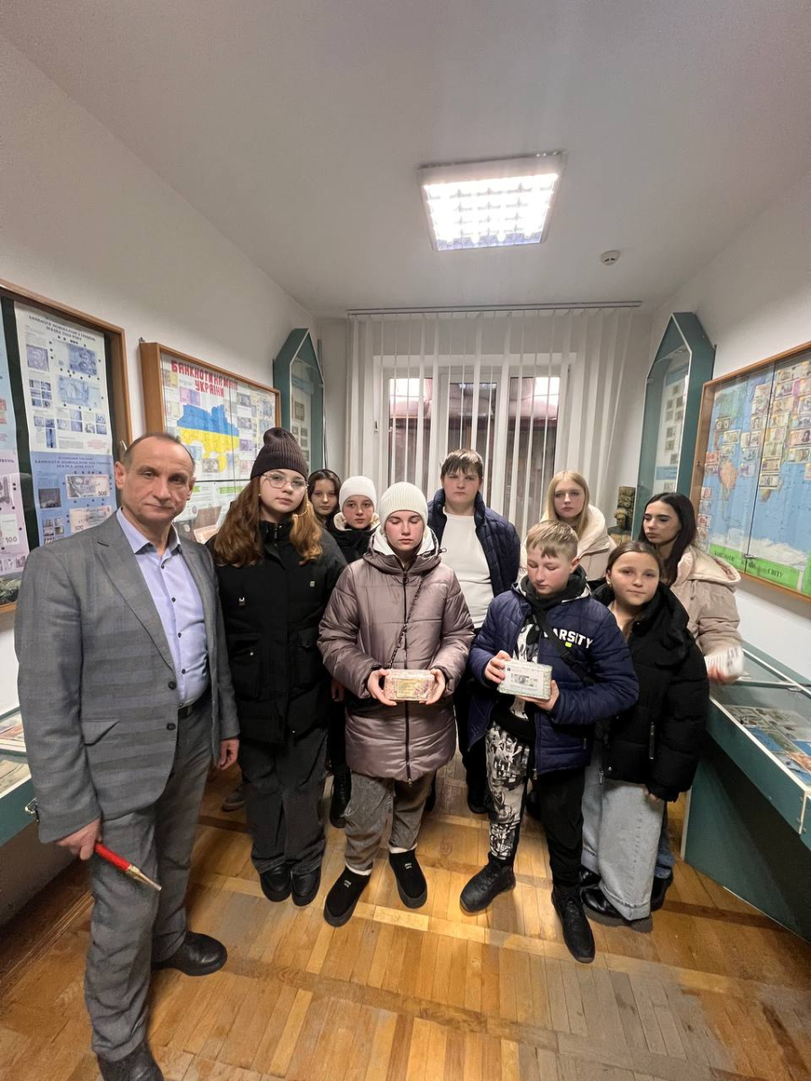 Під час пізнавальної екскурсії учні та вчителі дізналися про еволюцію грошей і розвиток грошового обігу на теренах України – від товарних форм обміну та перших монет до сучасних грошових знаків. Відвідувачі ознайомилися з історією національної валюти, починаючи від лічильно-вагової одиниці IX століття та срібних зливків XI–XIII ст., перших грошей Української Народної Республіки (1917–1920 рр.) і до сучасної гривні.